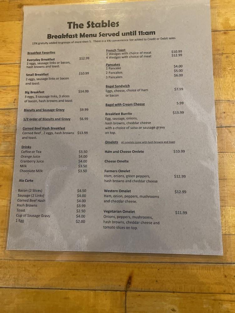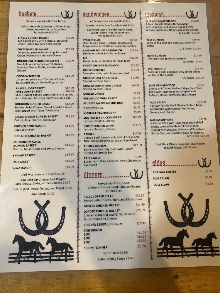The menu at Stables showcases a wide range of delicious offerings. From juicy burgers to scrumptious burritos, there is something for every palate. Breakfast options like omelets and hearty breakfast favorites ensure a strong start to the day. Expect friendly service and simple yet tasty food throughout the dining experience.