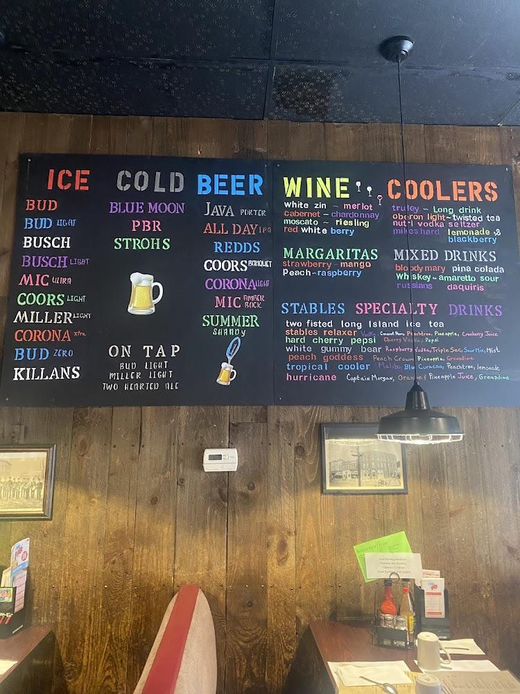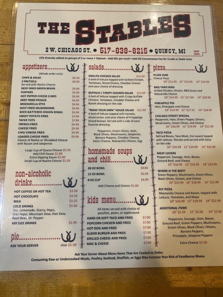 Welcome to Stables, your go-to destination for mouthwatering grilled dishes and a vibrant atmosphere in Quincy, MI. Located at 2 W Chicago St, we offer an extensive menu featuring local specialties, refreshing cocktails, and a variety of beers. Whether you're here for brunch, lunch, or dinner, enjoy our speedy service and relaxed ambiance, complete with café games and karaoke nights. Our accessible seating and parking make it easy for everyone to join the fun. Perfect for solo diners and groups alike, come savor delicious food and unwind at Stables—where great taste and good times meet!